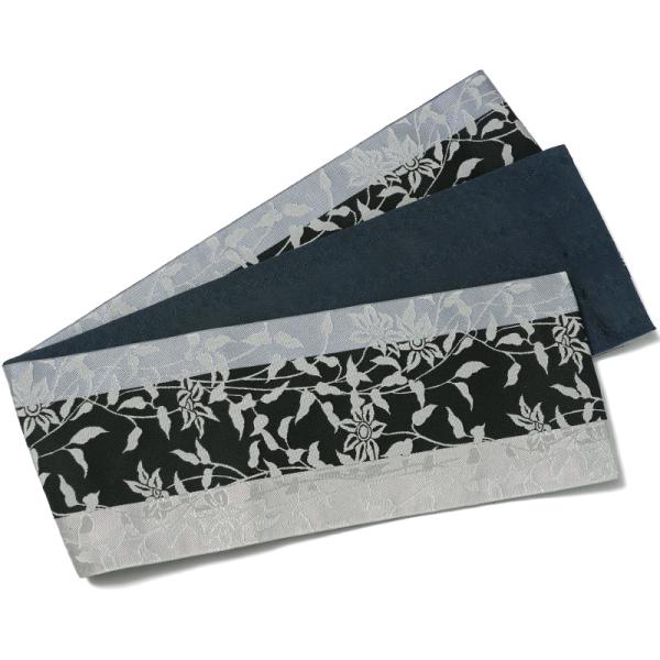 半幅帯 縞 鉄線花 黒 グレー 紺 モノトーン 古典柄 カジュアル レトロ シック 細帯 半巾帯 小袋帯 リバーシブル 日本製