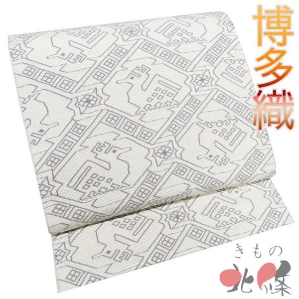 名古屋帯 なごや帯 中古 リサイクル 正絹 カジュアル 仕立て上がり 全通 博多織 有栖川鹿文 白色 鼠色 きもの北條 A1334-13
