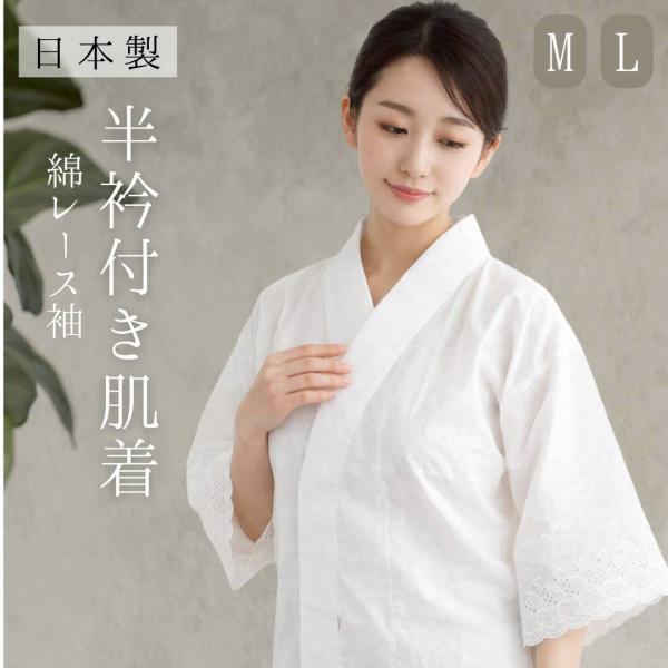 半衿付き肌襦袢 肌着 半襦袢 綿レース袖 カジュアル 白色 日本製 M/L 和装小物 着付け 新品 きもの北條 A1344-13