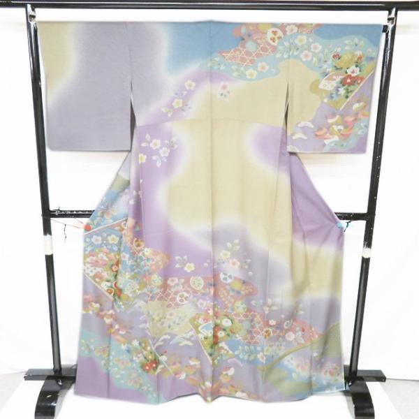 訪問着 着物 中古 正絹 袷 フォーマル 花模様 地模様 辻が花模様 淡香色 多色 身丈163cm 裄68cm L きもの北條 A1137-10