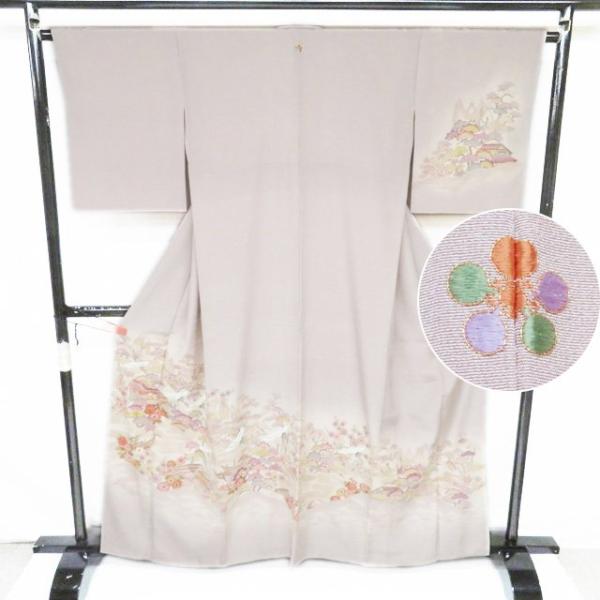 訪問着 着物 中古 正絹 袷 洒落紋 汕頭刺繍 スワトウ 花鳥の図 鶴 灰梅色 多色 身丈161.5cm 裄65cm M きもの北條 A1306-13