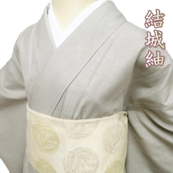 特選 結城紬 着物 中古 正絹 袷 カジュアル 縦縞模様 ストライプ 丸模様 白茶色 薄緑色 身丈153cm 裄65cm SA きもの北條 A1219-2