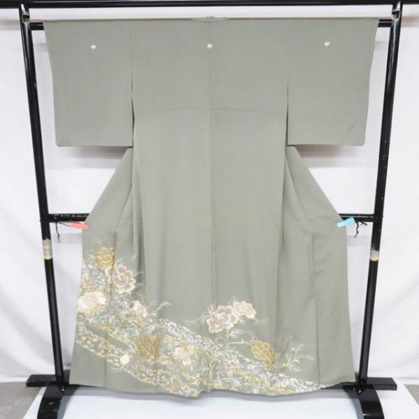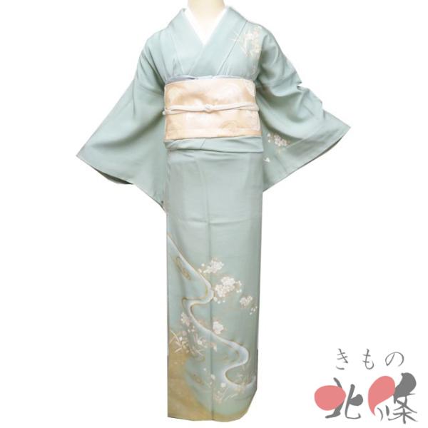 訪問着 着物 未使用 正絹 袷 フォーマル 落款 金駒刺繍 流水に花 桜 柳鼠色 多色 金 身丈155.5cm 裄63.5cm SA きもの北條 A1341-12