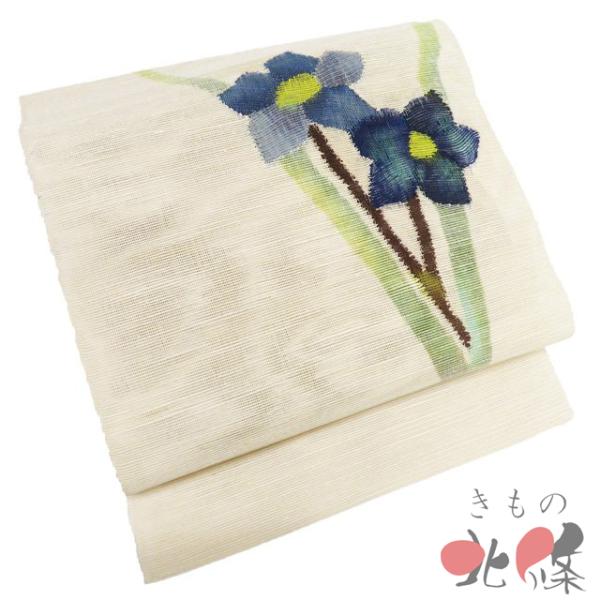 夏物 夏帯 名古屋帯 なごや帯 中古 リサイクル 正絹 紬地 カジュアル 仕立て上がり 花の図 象牙色 多色 きもの北條 A1339-23