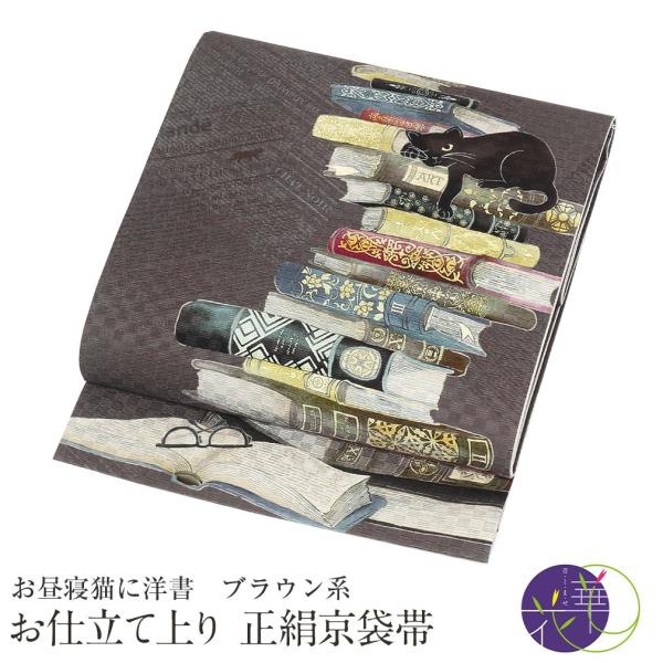 京袋帯 正絹 帯 ブラウン お昼寝猫に洋書 仕立て上がり 色無地 小紋 紬 街着