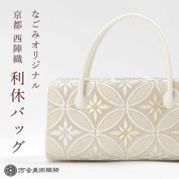 利休バッグ フォーマル 和装バッグ 西陣織 河合美術織物 正絹 唐織帯地使用 双縞七宝花菱文 ベージュ 金糸 銀糸 日本製 なごみオリジナル 礼装 結婚式 お茶会
