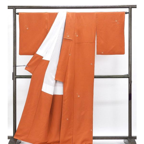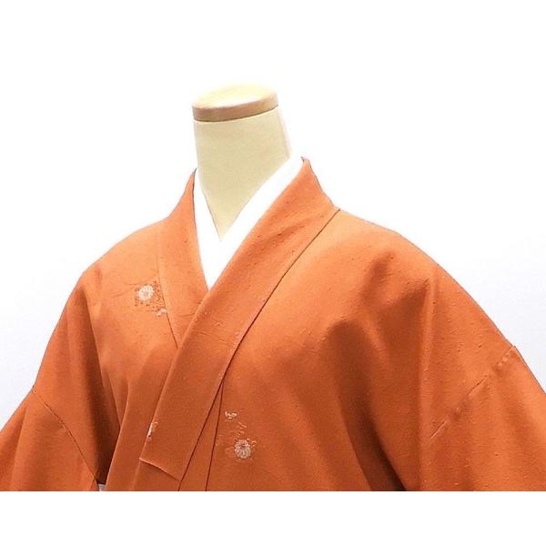 膨れ地紋と共色や灰色糸の縫取り菊笹地紋に柿茶色が染められています。