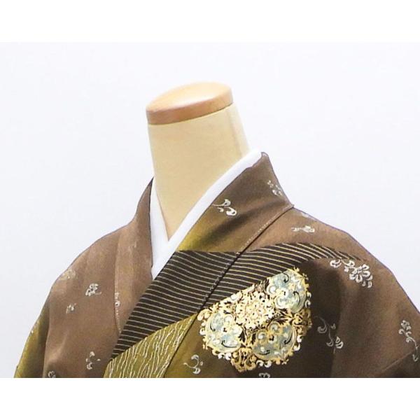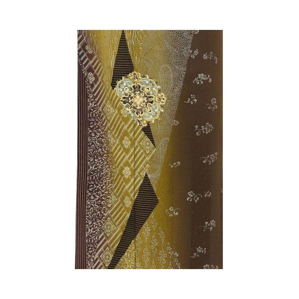 唐草縦縞地紋の茶色や菜種油・紫色の濃淡染分け地に水浅葱やオールドローズ・黒などの多色や金銀箔で宝相華や唐花・ペイズリー模様が柄付けされています。