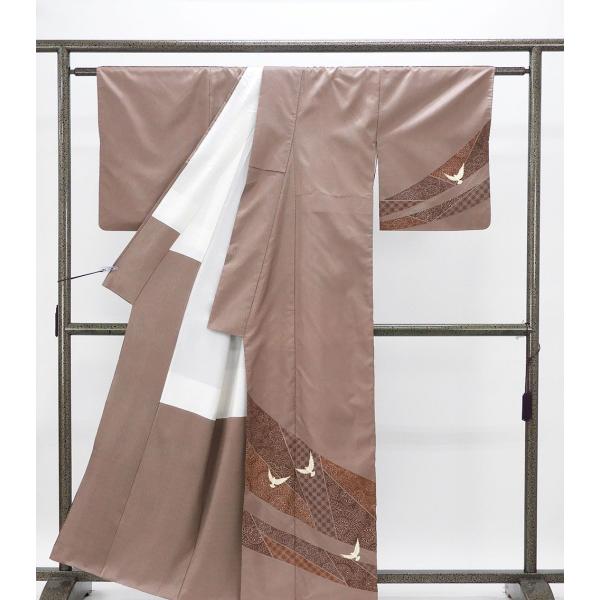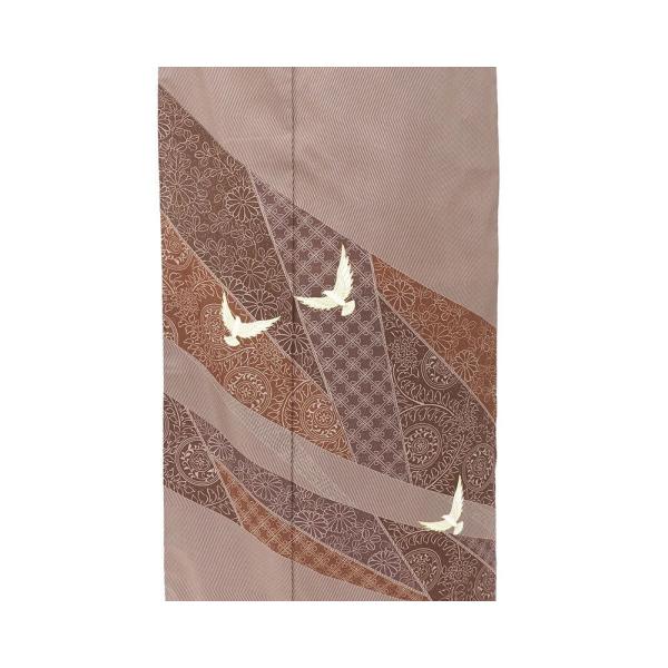 渋め紫鼠や灰梅の幾何縞地に渋め紫や葡萄茶・錆茶などの多色や金箔で鳩や菊・草葉模様が柄付けされています。