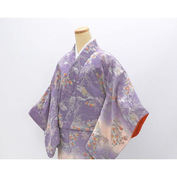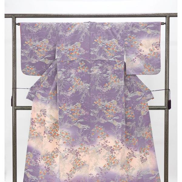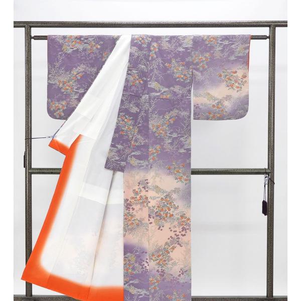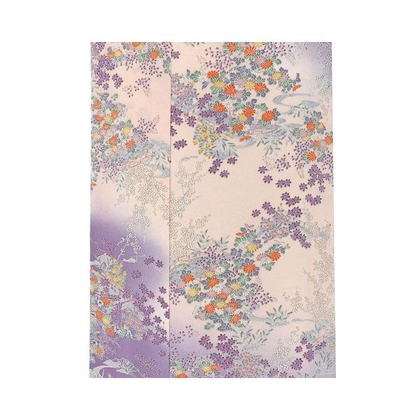 藤紫色地にピンクの裾ぼかしと紫や朱色・芥子などの多色で雲取四季花風景模様が柄付けされています。