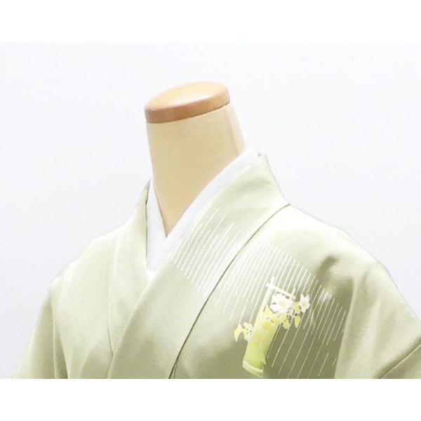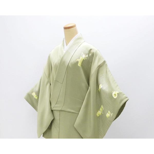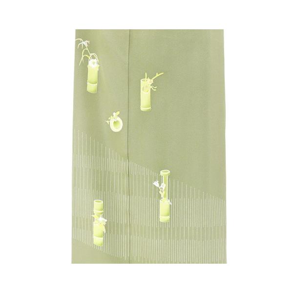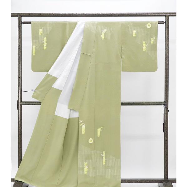 山葵鼠色地に黄緑やピンク・橙色などの多色で草花や竹筒模様が柄付けされています。