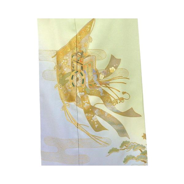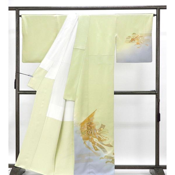 浅緑色地に青藤の裾ぼかしと草色や黄土色・ブルーなどの彩箔と金銀箔・螺鈿で霞御所車模様が柄付けされています。