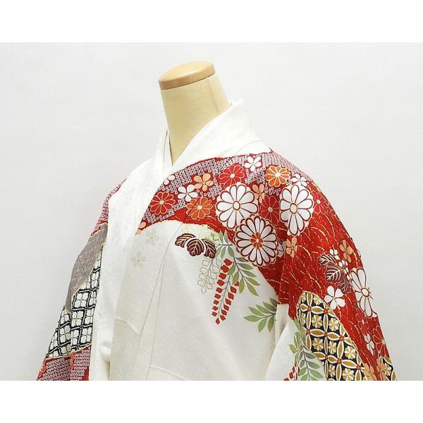 鞘型草花地紋の白地に多色と金箔・金駒で匹田や四季花模様が柄付けされています。