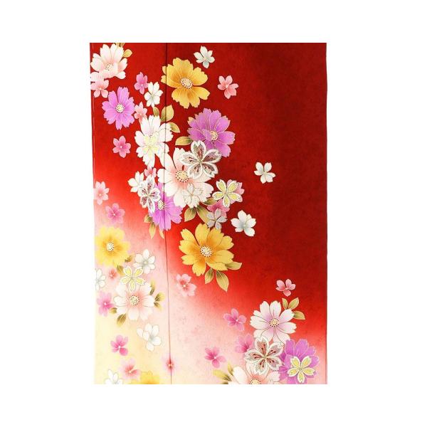 氷割地紋の赤色地になピンクとクリームの裾ぼかしと山吹色や薄紫・草色どの多色と金箔で花模様が柄付けされています。