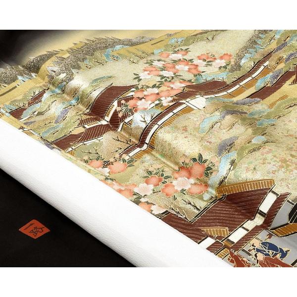 ピンクや水色・草灰などの彩箔や金箔で時代風景模様が柄付けされています。