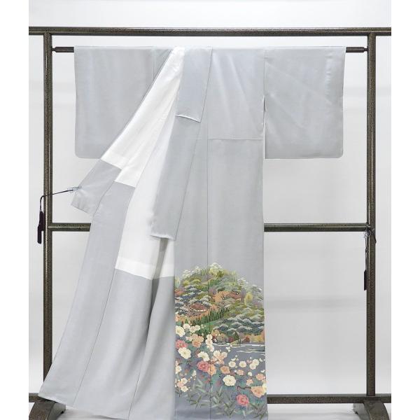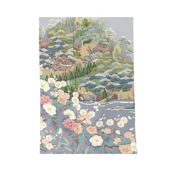 淡いブルーグレー地に濃淡裾ぼかしとピンクベージュや藍色・草色などの多色で四季花家屋風景模様が柄付けされています。