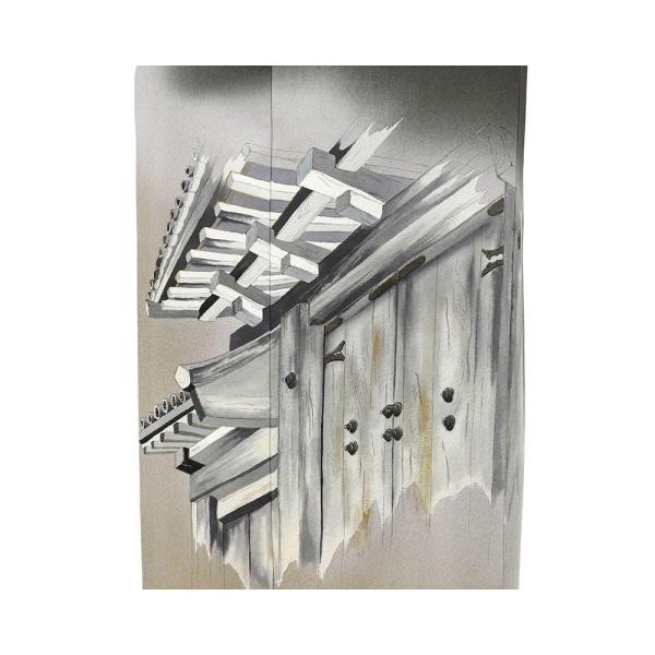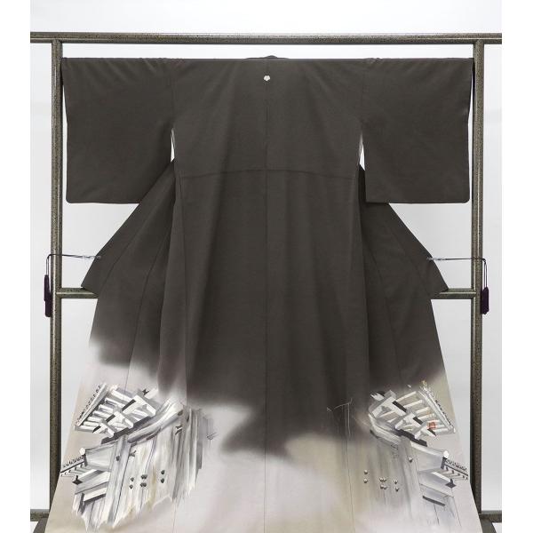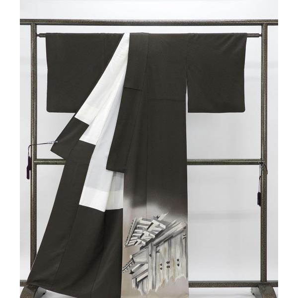 薔薇地紋の焦げ茶地に灰汁色や薄紫鼠の濃淡裾ぼかしとチャコールの濃淡や湊鼠・アイボリーなどの多色と金箔で数奇屋門模様が柄付けされています。