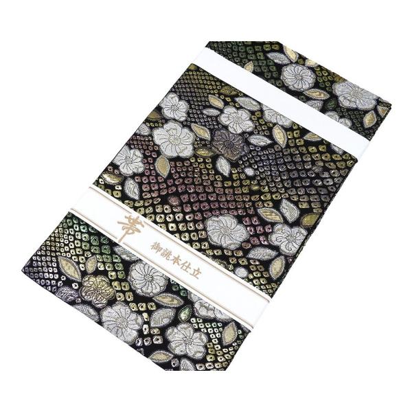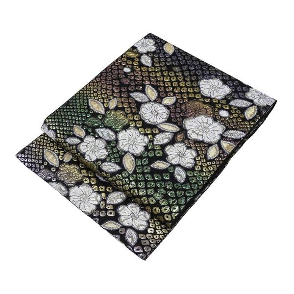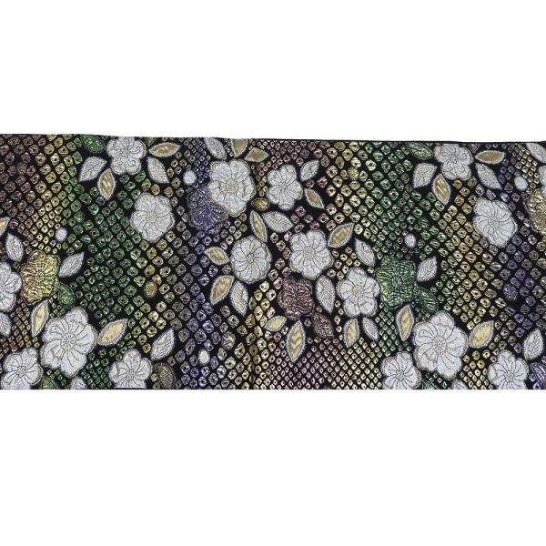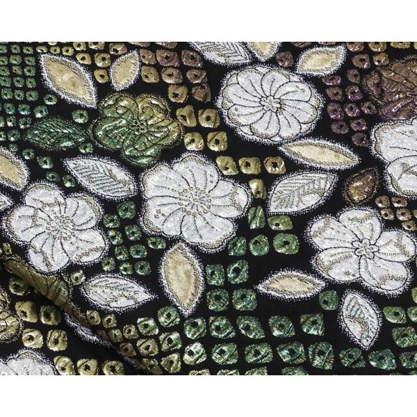 黒色地にグリーンやオーキッドピンク・パールグレーなどの多色のラメ箔と金銀糸で膨れ辻が花鹿の子模様が柄付けされています。