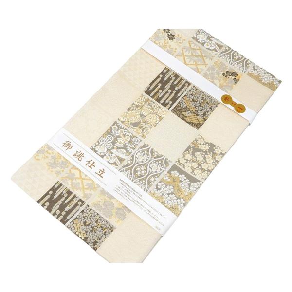 ベージュ地にアイボリーやサンドグレー・ダークブラウンなどの多色と金糸で格子吉祥四季花模様が柄付けされています。