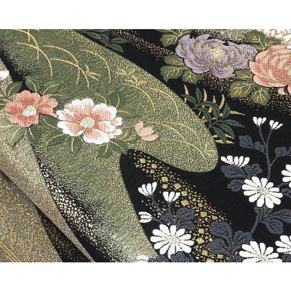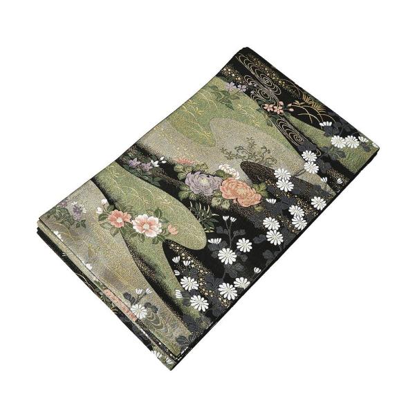 彩箔糸織り込みの黒色地に緑色や薄藤鼠の流水織分けとコーラルピンクや薄紫・藍鼠色などの多色と金糸で四季花模様が柄付けされています。