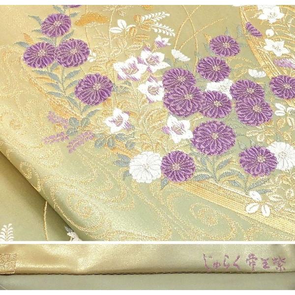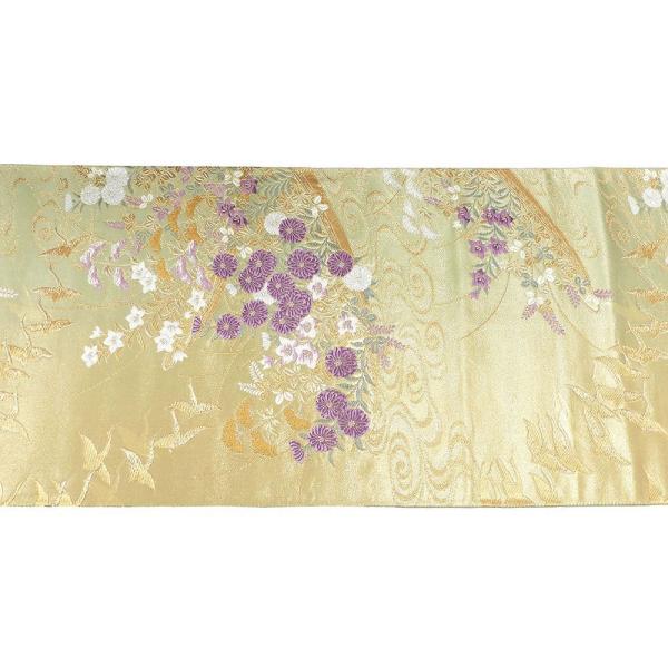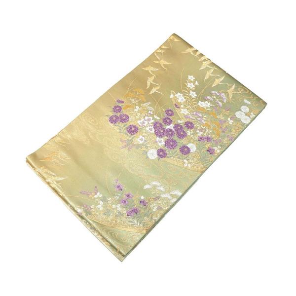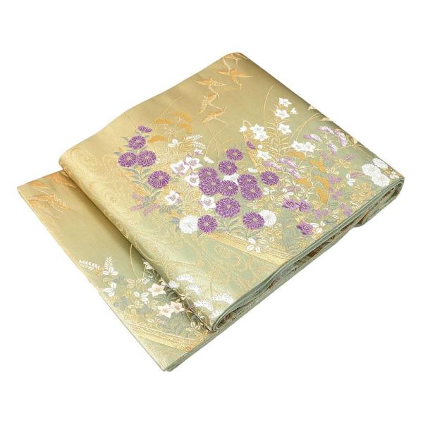 淡い金と浅緑の織分け地に青磁鼠色や紫・オフホワイトなどと金糸で舞鶴菊萩桔梗模様が柄付けされています。