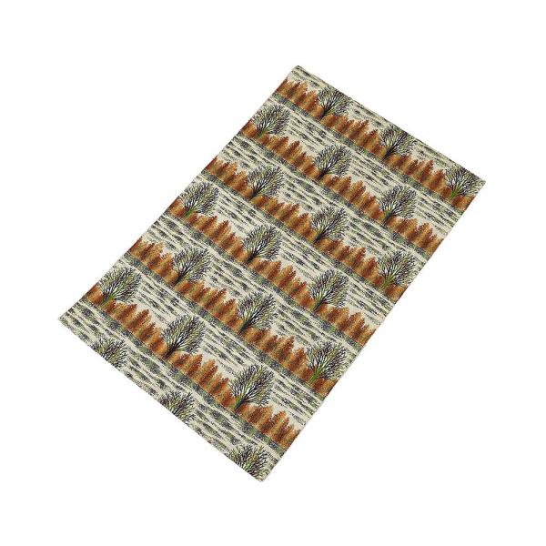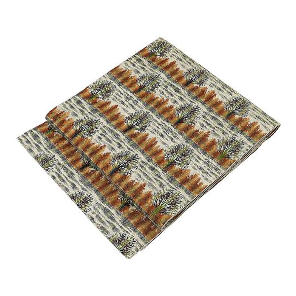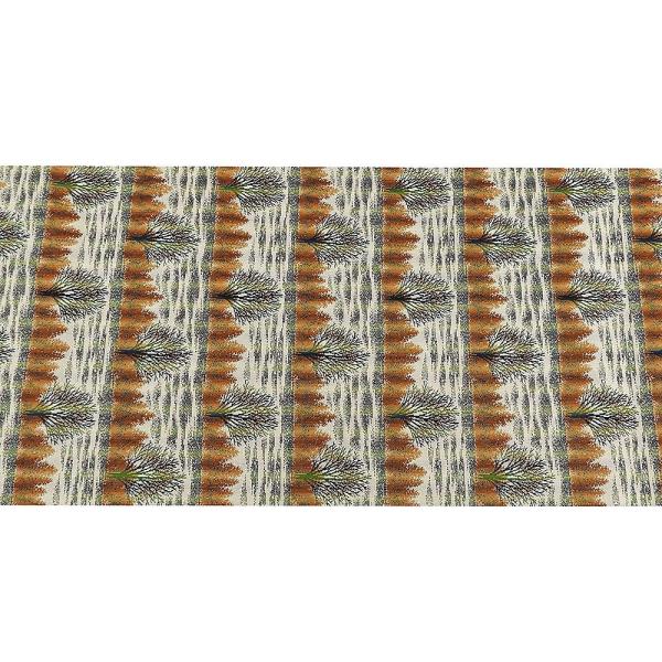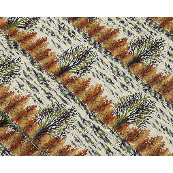 砂色地に茶色や緑・紺色などの多色と金糸で横段木立模様が柄付けされています。