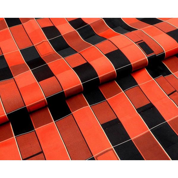 赤色の濃淡や黒・黄色で格子模様が柄付けされています。
