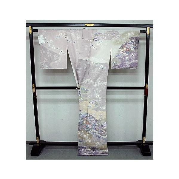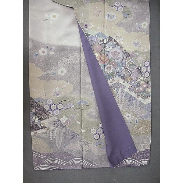 藤鼠色系のぼかしに四季草花をあしらった豪華で上品なお着物です。
