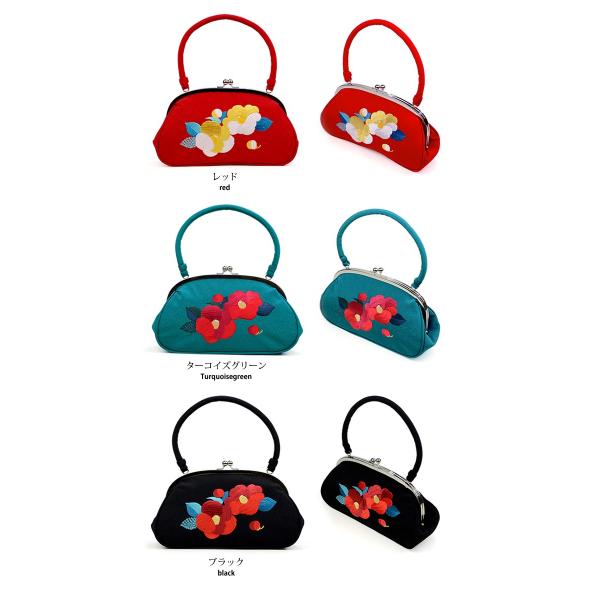 ※※振袖 バッグ 成人式 卒業式 洒落用 着物バッグ がま口 椿刺繍 レッド ターコイズグリーン ブラック