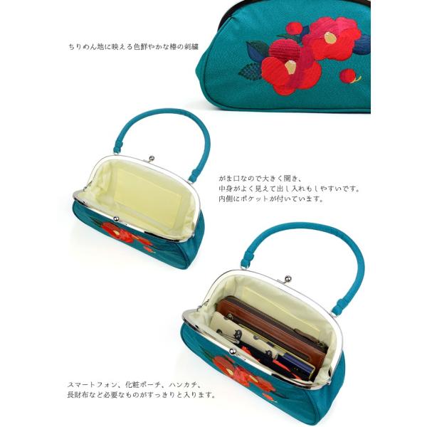 振袖用 バッグ 椿の刺繍 がま口 ちりめん レトロ ママ振 成人式 卒業式 結婚式 袴 ターコイズ 赤 黒 爆買