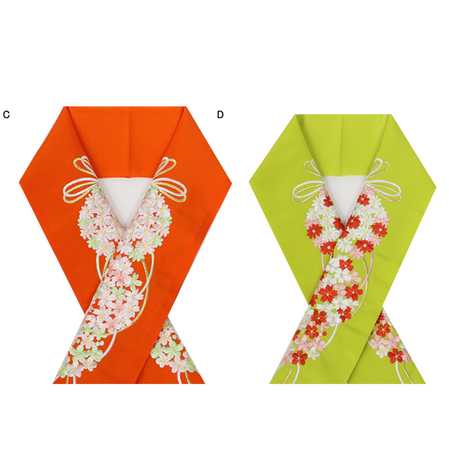 振袖用の半衿のレンタルです。最新の豪華な刺繍の半襟を一枚からレンタルしていただけます。すべて当社の国内工場で刺繍している日本製になります。桜や梅、人気の椿柄などレトロで可愛い刺繍半襟をたくさんご用意しております。振袖フルセットレンタルなどでセットになっている半襟の刺繍はボリュームがすごく少ない地味なものがほとんど。刺繍半衿などの小物を豪華で可愛いものにしておくとそれだけでコーディネート全体がランクアップしますよ。ぜひ振袖用刺繍半衿のレンタルをご活用くださいね!