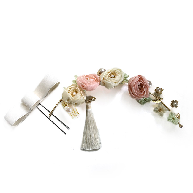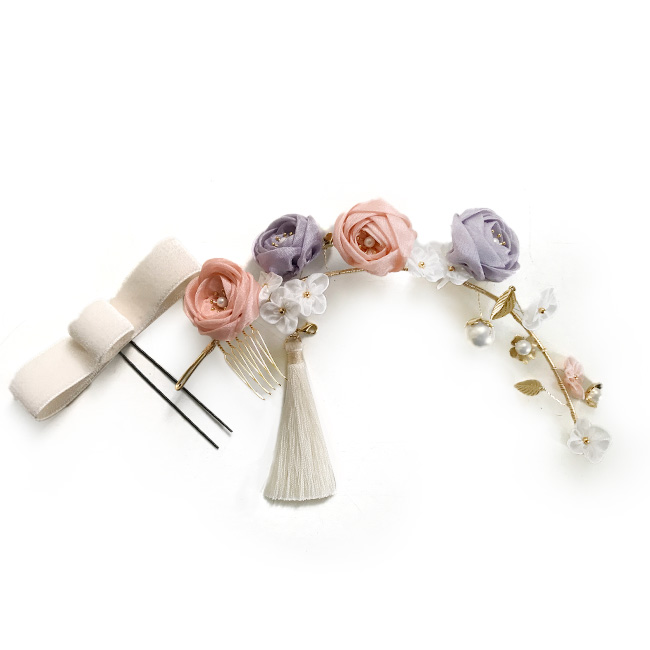 振袖用の髪飾りです。可憐な巻き薔薇のヘッドドレスは和装に限らず、洋装でもお付けいただけます。ベルベットのリボンと房もついた3点セットです。