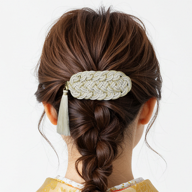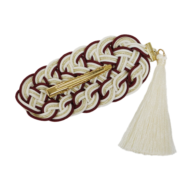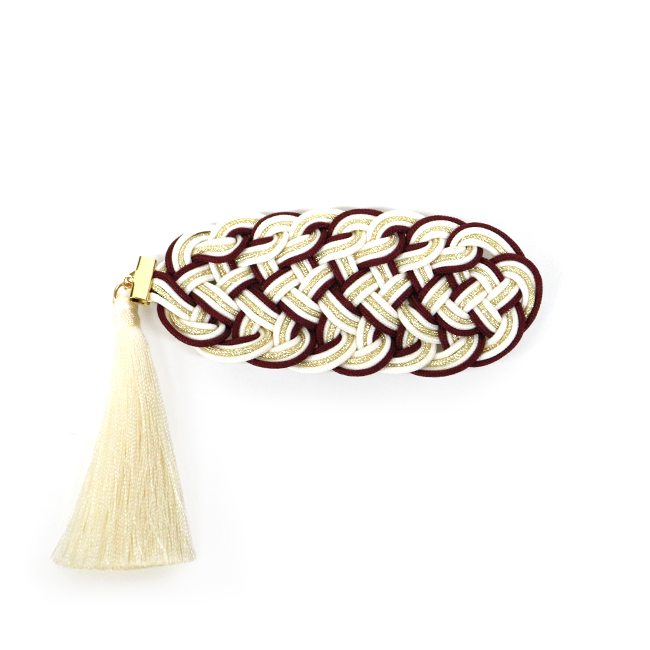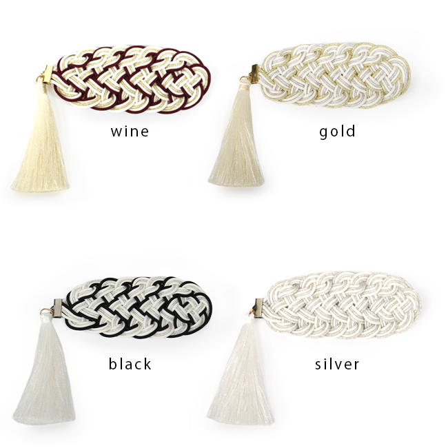 飾り結びを可愛いバレッタタイプにした髪飾りです。手のひらに乗るぐらいの小ぶりサイズでシンプルなデザインですが、上品かつ存在感のある髪飾りになっています。卒業式の袴や二尺袖に合わせたり、普段の着物でも使いやすいデザインです。(房は取り外しできません)