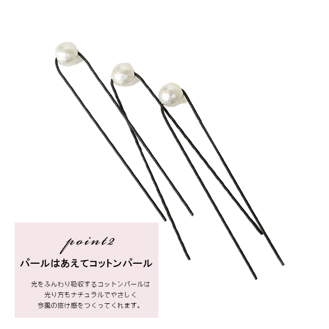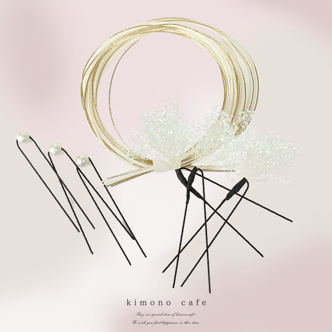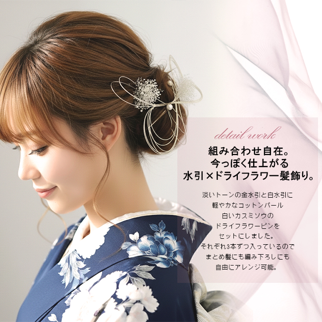淡い金色の水引、コットンパール、カスミソウ:今っぽい素材をぎゅっと詰め込んだ、使いやすさ重視の髪飾りセットです。ピンタイプだから配置も自由、挿し直しも簡単。水引は強すぎない淡い金色を使用しているので、古典柄にも今風の振袖にも合わせやすいのが特徴です。パールはコットンパールなので、重たく見えずナチュラルな仕上がりに。すべてピンタイプで、3本ずつ入っているため、髪型やボリュームに合わせて調整しやすいセットです。