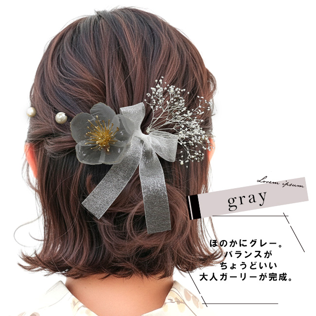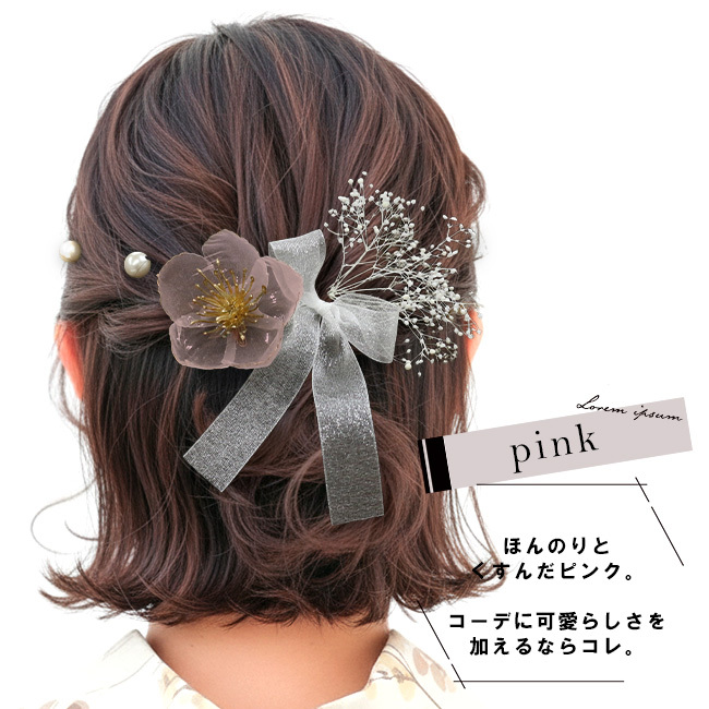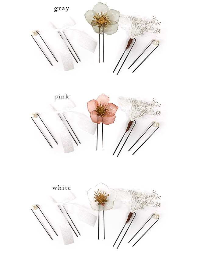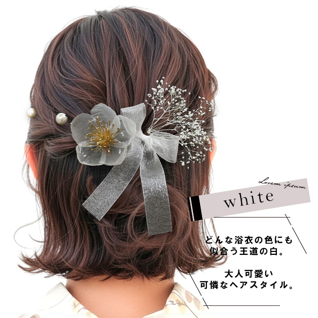 浴衣や袴にぴったりの、上品でナチュラルな髪飾り5本セット。お花・リボン・カスミソウ・パール2本のそれぞれ独立したパーツだから、髪型に合わせて自由にアレンジできます。まとめ髪に添えるだけで、盛りすぎないのに印象的な大人かわいいヘアスタイルに。夏祭り・花火大会・成人式・卒業式など、さまざまな和装シーンにおすすめです。