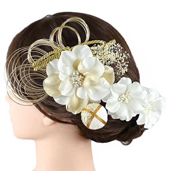 髪飾り 成人式 つまみ細工 水引 玉飾り ゴールド かすみそう 振袖 袴 花 菊 青緑 エメラルドグリーン シャンパンゴールド 白 生 No.9-5546