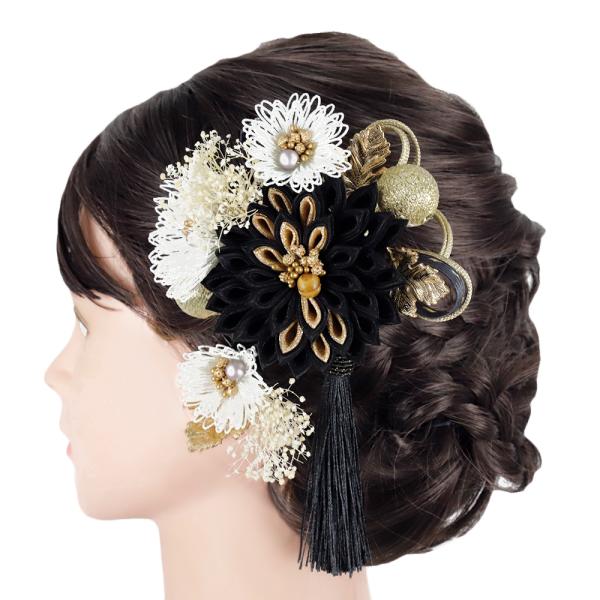 髪飾り 成人式 つまみ細工 玉飾り かすみそう シフォンジョーゼット パールビーズ 房 ゴールド 振袖 袴 花 葉 黒 ダークグレー No.9-5540