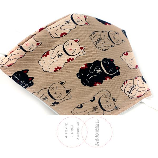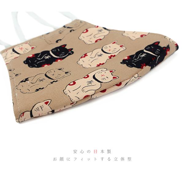 マスク 布マスク 京都の職人が作ったマスク ベージュ 茶 猫 ネコ 招き猫 寿 千万両 日本製 綿 立体型マスク 繰り返し 洗える 4 No.19-0071