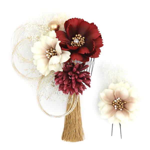 髪飾り 成人式 水引 ゴールド 振袖 袴 花 赤 紫 白 房 レース かすみそう ビーズ ラインストーン 大きい 小さい 2点セット 着物 No.12-1083