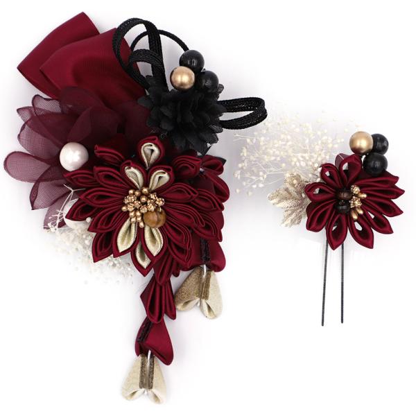 髪飾り 成人式 振袖 2点セット 赤紫 ワインレッド 黒 ベージュ 白 ゴールド つまみ細工 剣つまみ さがり 水引 かすみそう 和柄 No.9-5374