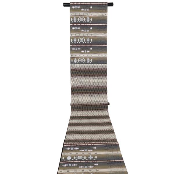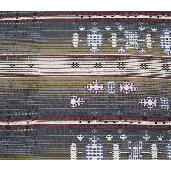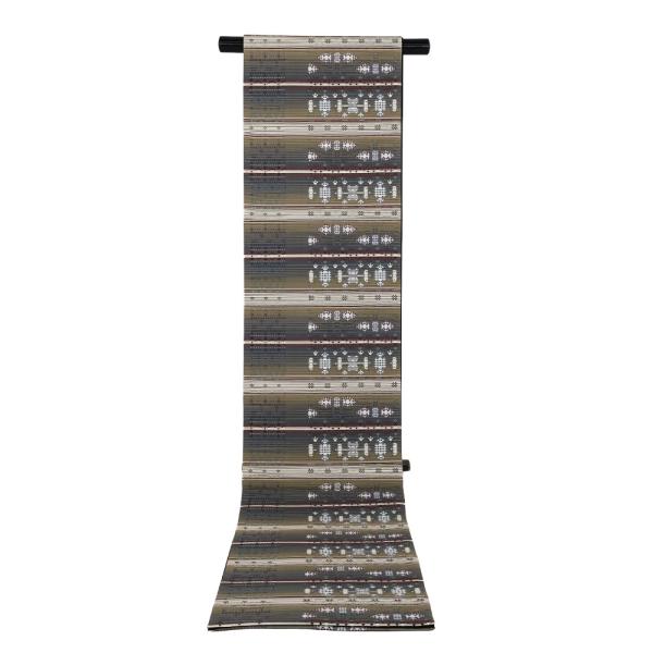 お洒落訪問着用 花織紬 袋帯 正絹 グレー 緑 ベージュ 赤紫 白 幾何模様 横縞 Lサイズ F7321 新品 ふくろおび レディース シルク 送料込み