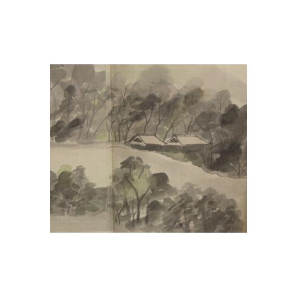 緑かかったベージュ地手描き水墨画 山水画 <br>