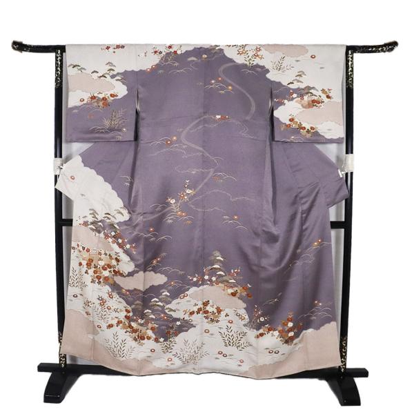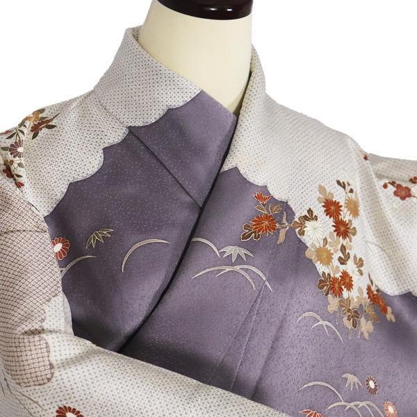訪問着 袷 正絹 グレー紫 白 菊 松竹梅 鹿の子 Mサイズ ki31041 美品 レディース シルク フォーマル 30代 40代 50代 送料込み