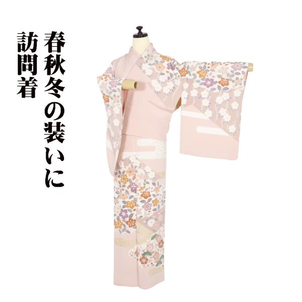 訪問着 袷 正絹 ピンク 薄赤紫 オフホワイト 桜 唐花 橘 菊 松竹梅 トールサイズ ki30446 美品 レディース シルク フォーマル 送料込み