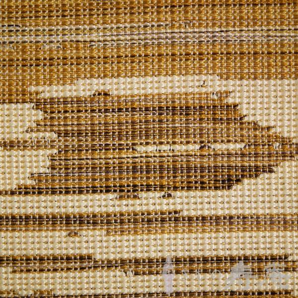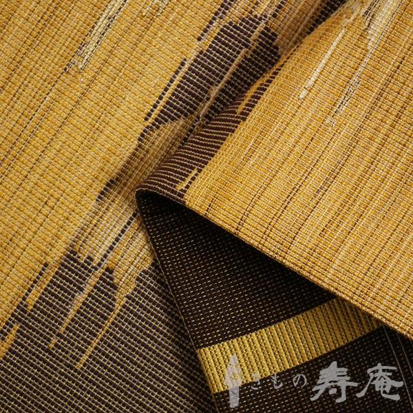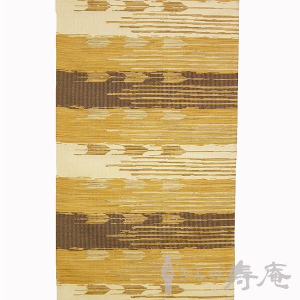古来伝統の泥染技法と現代染色法を併用し現代感覚を取り入れた創作品です。地色には、落ち着いたベージュ系を選び、しっとりとしたやわらかい糸を用いた、幾何学模様の矢羽を裏面には茶色とベージュのボーダー柄で六通柄を織りこんでいます。