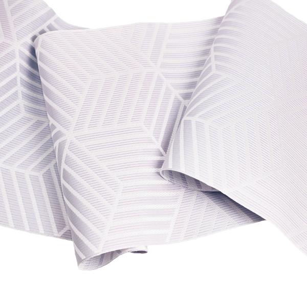 薄紫色とグレーのボカシの生地に亀甲網代の模様が織り込まれたシンプルでモダンな名古屋帯です。