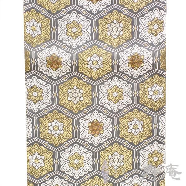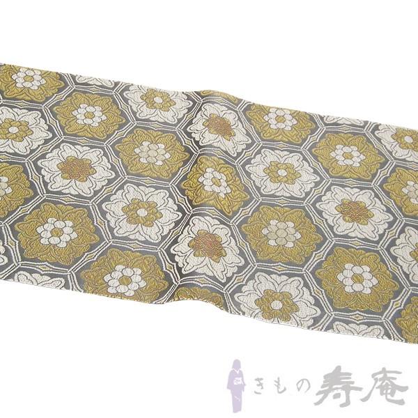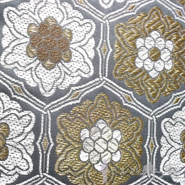落ち着いたグレー色の生地に金糸と白糸で亀甲の総柄で織り上げたフォーマル袋帯です。