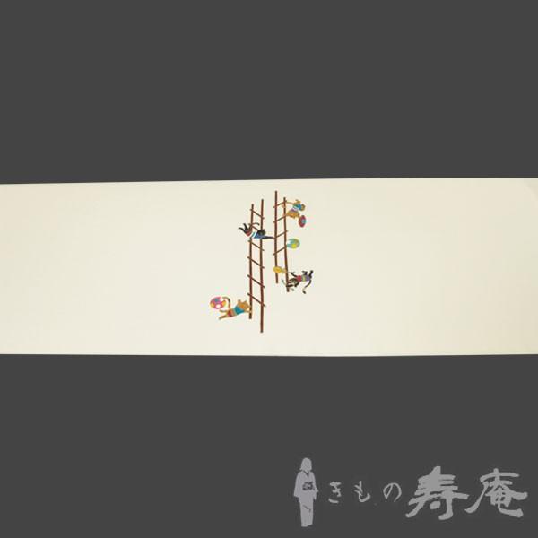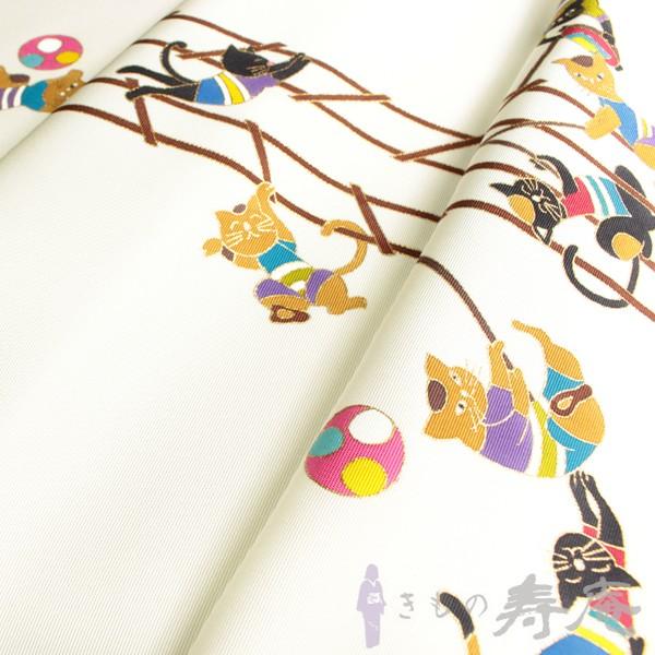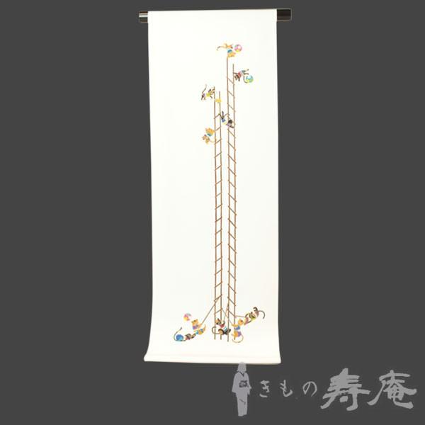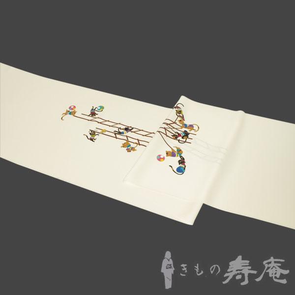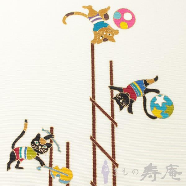 塩瀬 名古屋帯 仕立て込み 猫のはしご乗り 白色 染九寸帯 女性用 新品 未仕立