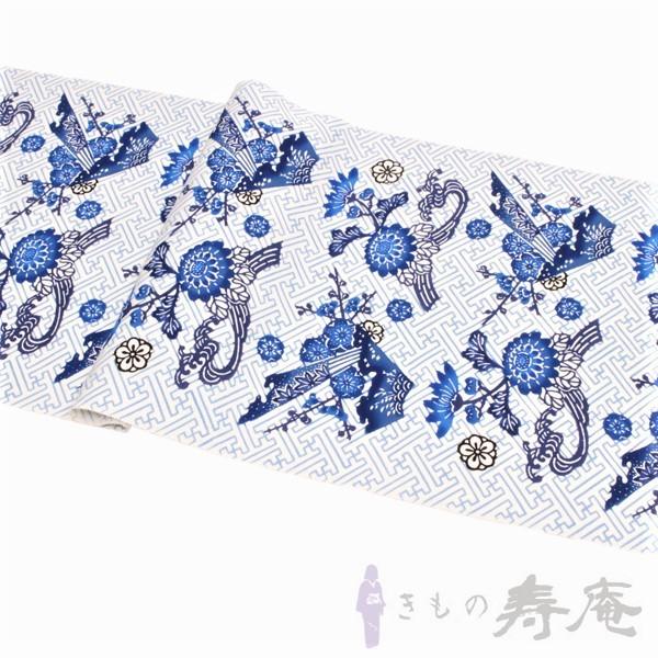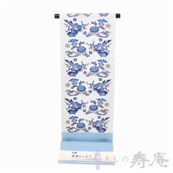 紅型染九寸名古屋帯 仕立て込み 知念初子 本場琉球帯 紗綾型 花 白 アビスブルー 女性用 新品 未仕立