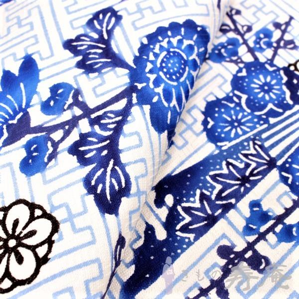 紗綾型の地紋の上に沖縄の海をイメージしたブルー色の紗綾型の柄を描き海と花を藍色とブルーで染めています。盛夏以外の時期に締めて頂ける綺麗な帯に仕上がっています。